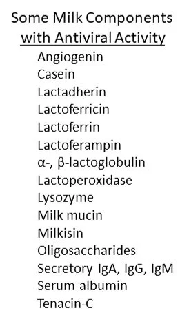 First, consider peer-reviewed studies demonstrating antiviral properties of a suite of bioactive components of raw mammalian milks, including bovine milk [4,5,7-9,12-14,16,17,19]. Multiple researchers note that some of the antiviral components of milk listed in the text box below are likely function synergistically, meaning effects are greater in combination than independently, an observation particularly relevant in complex gut ecosystems of humans that include innate and adaptive immune systems. Many of these bioactive components of raw milk are also sensitive to heat and may be absent, inactive, or present in lower concentrations in pasteurized milks. Considering the extensive literature on antiviral activity in milk, clinical researchers [3] applied deep scientific knowledge to recommend that infants not be deprived of raw breastmilk due to the presence of viruses. The benefits of feeding raw breastmilk including its antiviral components to infants outweighs the very small risk of infection, from their perspective as clinical researchers, one associated with the Italian Association of Human Milk Banks.